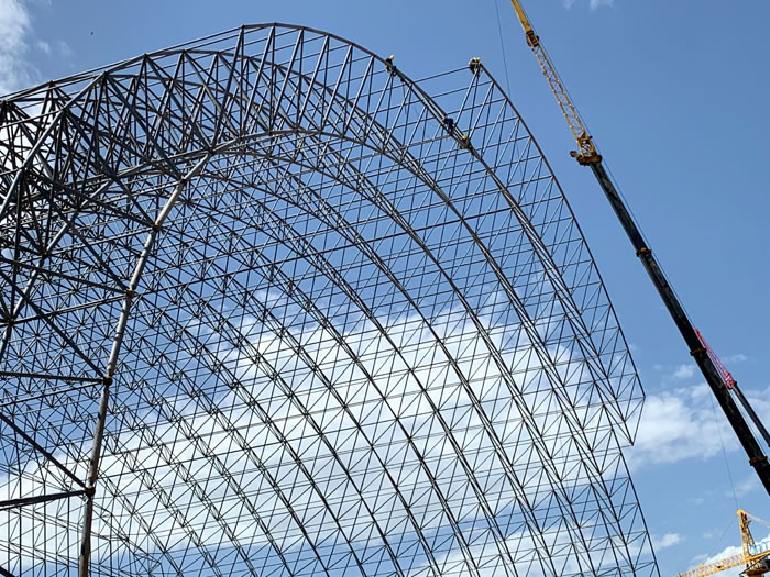 (2)网架加工前应对现场尺寸进行复测,确认无误后方可进行加工、安装;网架制作、运输、安装应遵守《空间网格结构技术规程》JGJ7-2010、《钢网架青铜峡螺栓球节点》JG/T 10-2009、《钢网架青铜峡螺栓球节点用高强度螺栓》 GB/T 16939-2016、《青铜峡钢结构青铜峡工程青铜峡施工规范》 GB50755-2012、《青铜峡钢结构青铜峡工程施工质量验收标准》 GB50205-2020。
